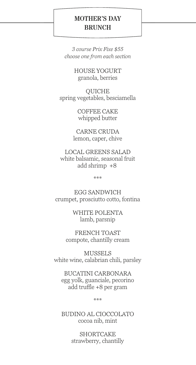 Reservations are available by phone or through Resy beginning Sunday, April 12th at 10 AM.
